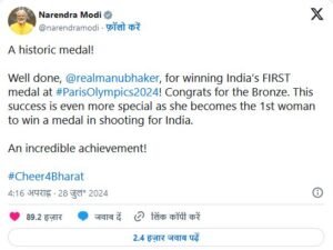 पेरिस में ब्रॉन्ज मेडल जीतने पर पीएम मोदी ने उन्हें बधाई दी. पीएम मोदी ने एक्स पर पोस्ट किया, ‘एक ऐतिहासिक पदक! बहुत बढ़िया, मनु भाकर, पेरिस ओलंपिक 2024 में भारत का पहला पदक जीतने के लिए बधाई. यह सफलता और भी खास है क्योंकि वह भारत के लिए निशानेबाजी में पदक जीतने वाली पहली महिला बन गई हैं. एक अविश्वसनीय उपलब्धि!’.