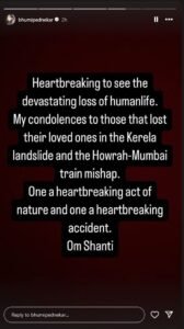 उधर बॉलीवुड एक्ट्रेस भूमि पेडनेकर ने वायनाड लैंडस्लाइड मामले पर अपना पक्ष रखा है. उन्होंने अपने ऑफिशियल इंस्टाग्राम स्टोरी पर एक नोट साझा किया है, जिसमें लिखा है, ‘मानव जीवन की विनाशकारी क्षति को देखकर दिल टूट गया. केरल लैंडस्लाइड और हावड़ा-मुंबई ट्रेन एक्सीडेंट में अपने प्रियजनों को खोने वालों के प्रति मेरी संवेदना. एक नेचर का हार्टब्रेकिंग एक्ट और दूसरा हार्टब्रेकिंग एक्सीडेंट. ओम शांति.’