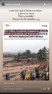 नेशनल क्रश से मशहूर साउथ की हसीना रश्मिका मंदाना ने वायनाड लैंडस्लाइड मामले पर दुख प्रकट किया है. उन्होंने अपने ऑफिशियल इंस्टाग्रा स्टोरी पर एक घटना का एक पोस्ट शेयर किया है और कैप्शन में लिखा है, ‘मैंने यह देखा. इसे देखकर मेरा दिल टूट गया है. मुझे बहुत खेद है. यह डरावना है. परिवारों के लिए प्रार्थनाएं.’