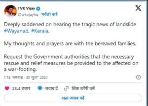 साउथ स्टार विजय ने मंगलवार को वायनाड में हुई घटना पर शो जताया है. उन्होंने वहां के सरकारी अधिकारियों से अनुरोध करते हुए कहा कि वे प्रभावितों आवश्यक साम्रगी दें. विजय ने अपने ऑफिशियल एक्स (पूर्व में ट्विटर) में लिखा है, केरल के वायनाड में लैंडस्लाइज की ट्रैजिक न्यूज सुनकर बहुत दुख हुआ. मेरी संवेदनाएं और प्रार्थनाएं पीड़ित परिवारों के साथ हैं. सरकारी अधिकारियों से अनुरोध है कि प्रभावितों को आवश्यक बचाव और राहत की चीजे दें.