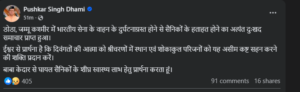 हादसे पर उत्तराखंड के मुख्यमंत्री पुष्कर सिंह धामी ने दुख जताते हुए कहा कि डोडा, जम्मू कश्मीर में भारतीय सेना के वाहन के दुर्घटनाग्रस्त होने से सैनिकों के हताहत होने का अत्यंत दुःखद समाचार प्राप्त हुआ. ईश्वर से प्रार्थना है कि दिवंगतों की आत्मा को श्रीचरणों में स्थान एवं शोकाकुल परिजनों को यह असीम कष्ट सहन करने की शक्ति प्रदान करें.